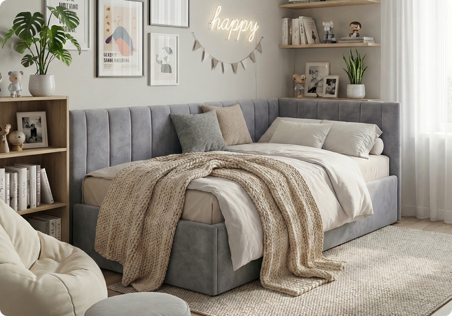 Из 300+ вариантов — велюр, рогожка, шенилл, бархат и другие. Используем гипоаллергенные и износостойкие ткани